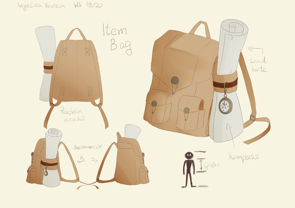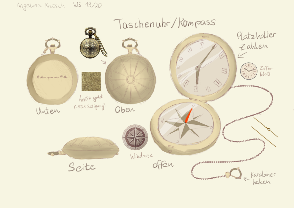 I created 2 Concepts for the 3D Object. The backpack Charlié wears and a pocketwatch that includes a compass.