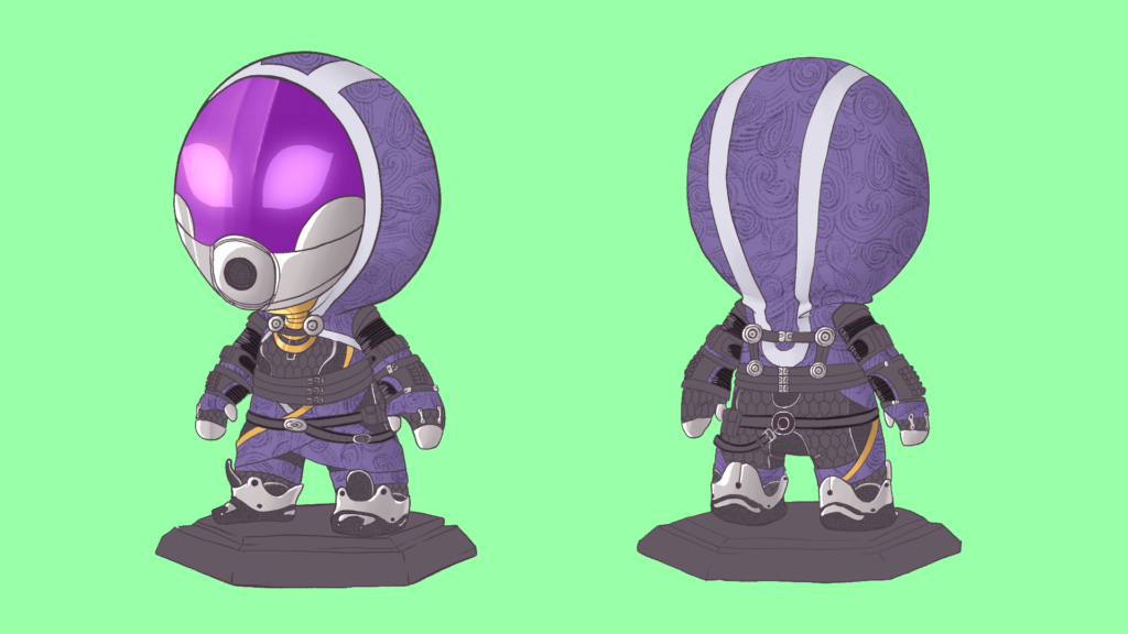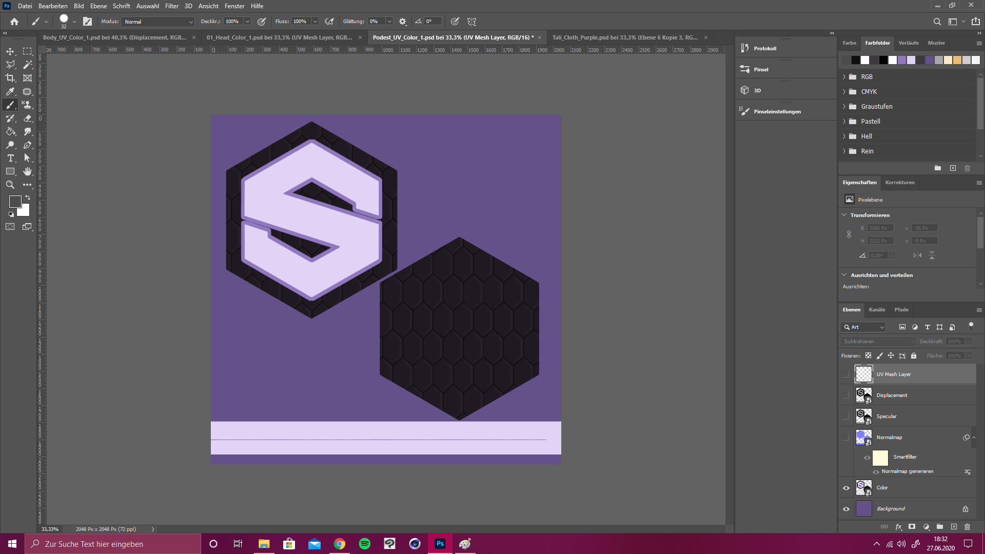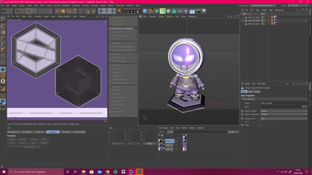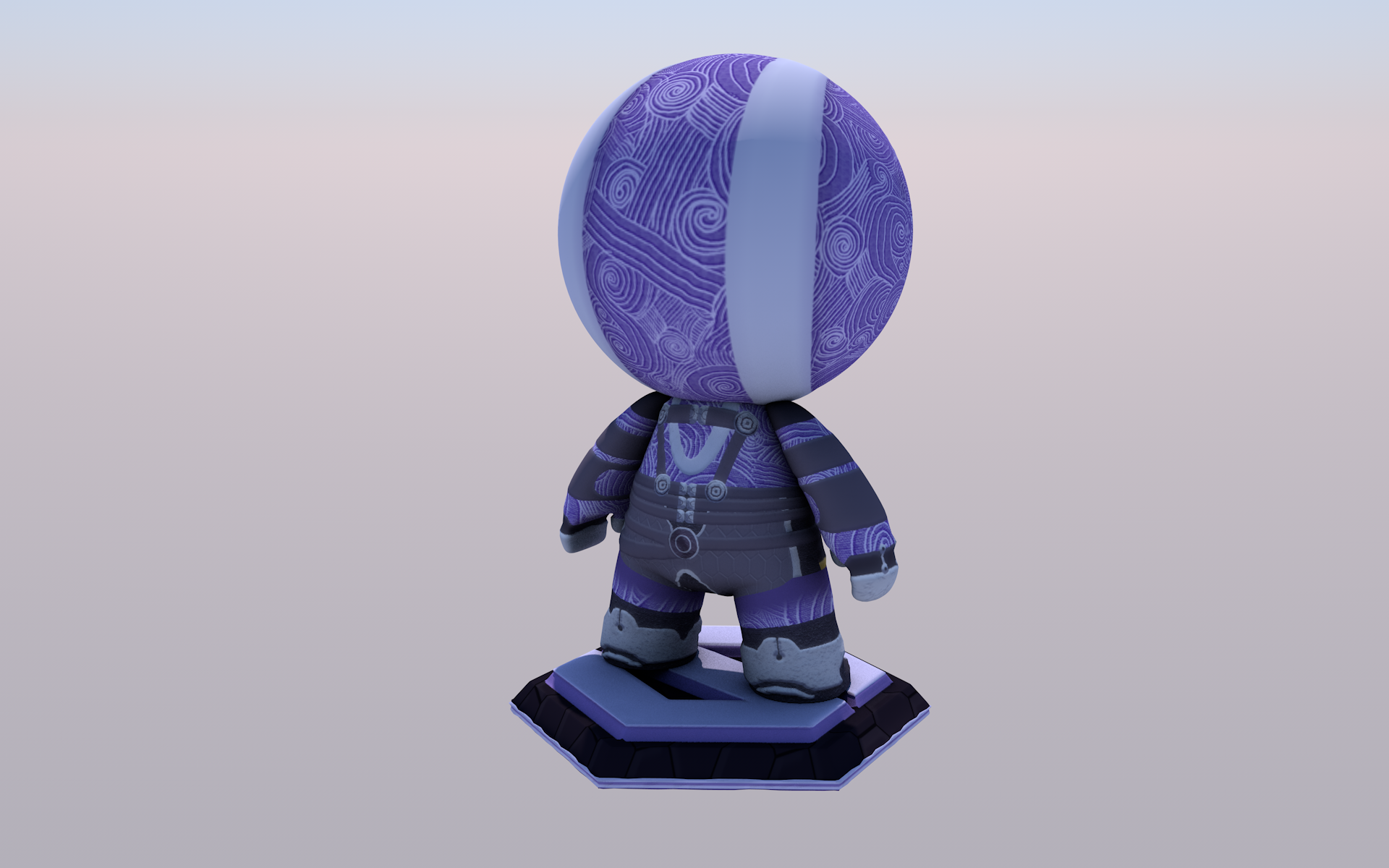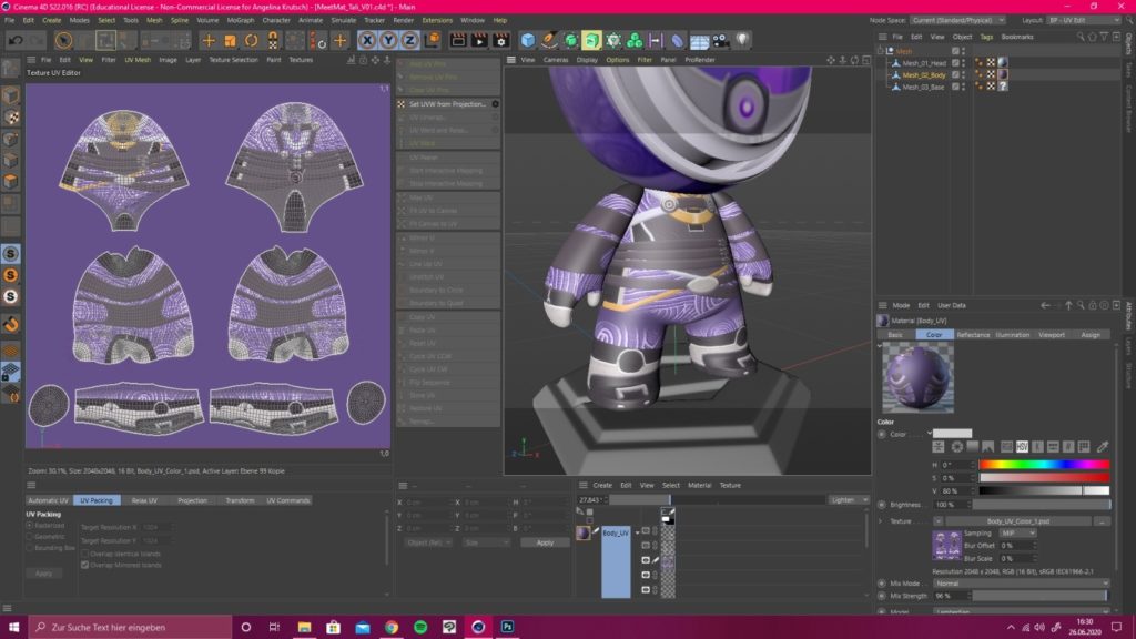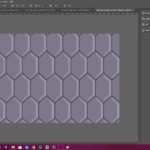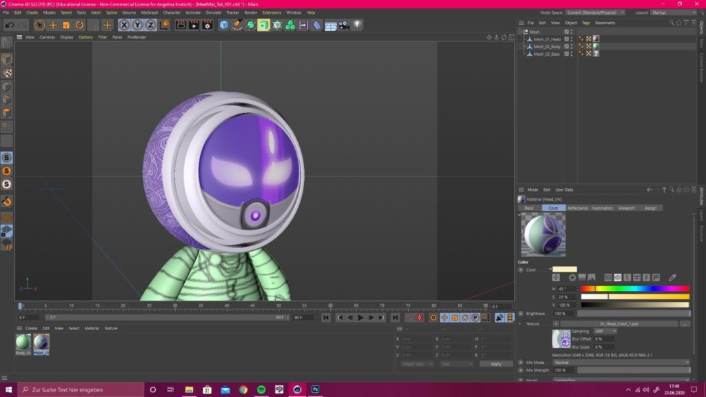 I unwrapped the Meetmat in Cinema and started to create the texture on the map I created. Meanwhile I had built two patterns for Tali. One to emulate her honeycomb-esque pattern and the other swirly one of her clothing. Of course we also had to think of the Bumb- and normal-masks as well. Yet because of all the tedious back and forth testing of the look on the meetmat I somehow corrupted the file with the map and meetmat, one day before it was due. So I had to cut the Meetmat open again, which wasn’t as tedious on this try as I already knew my pattern.