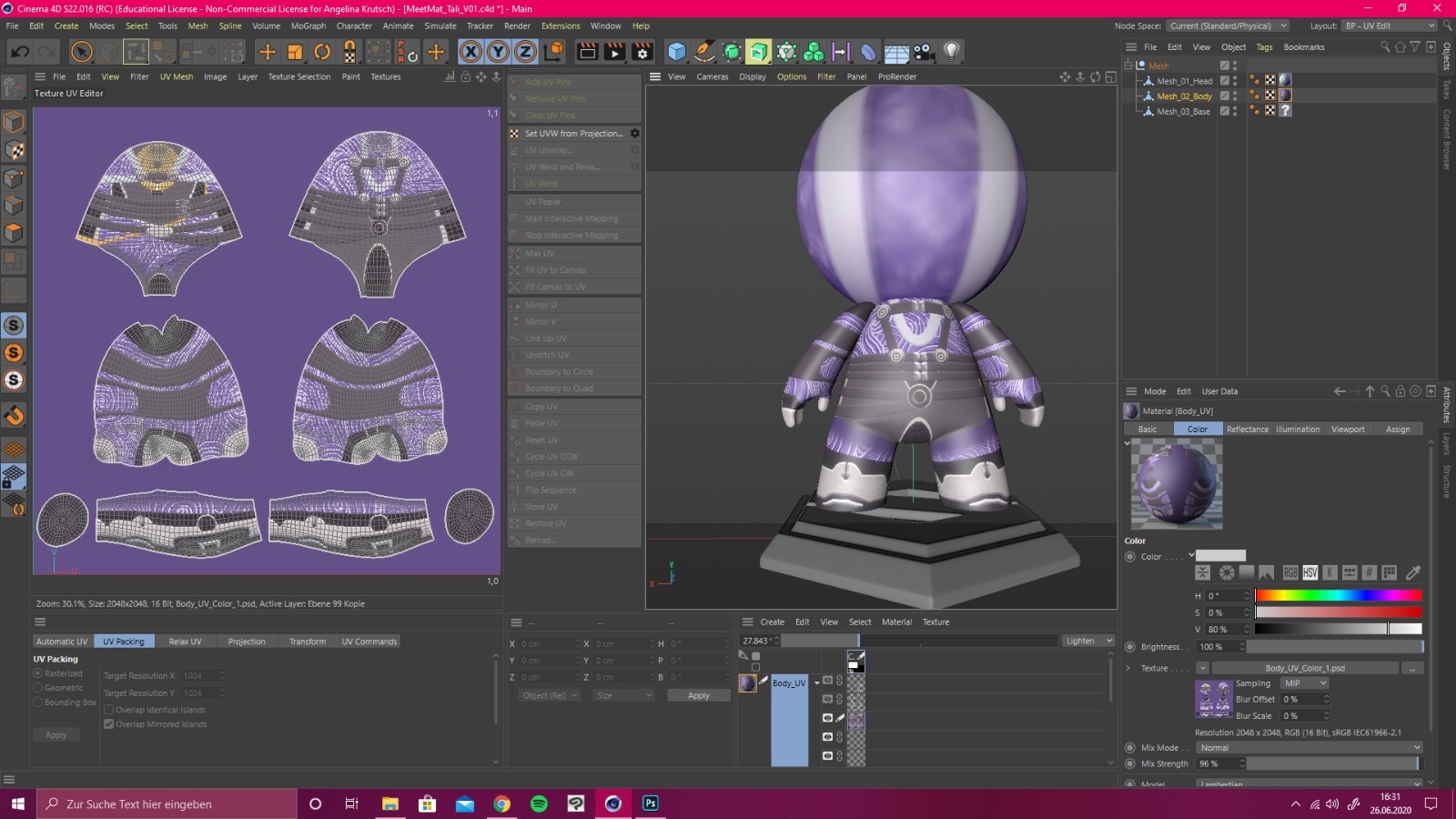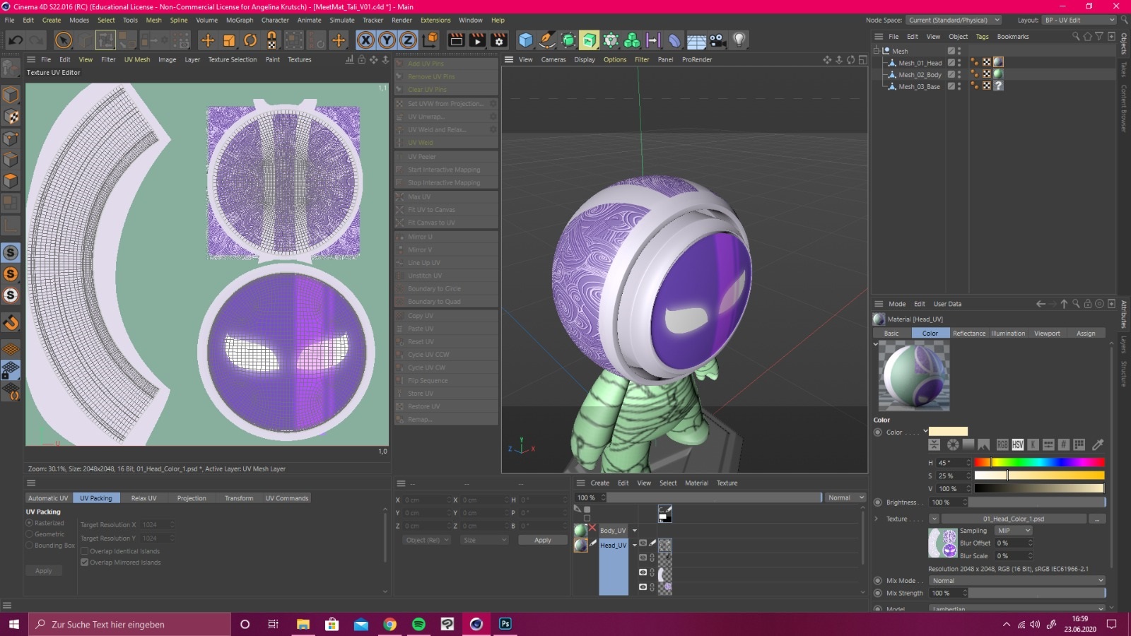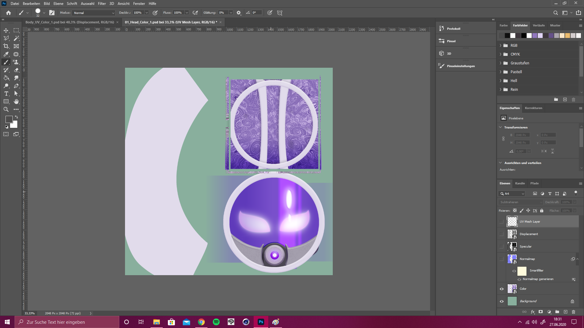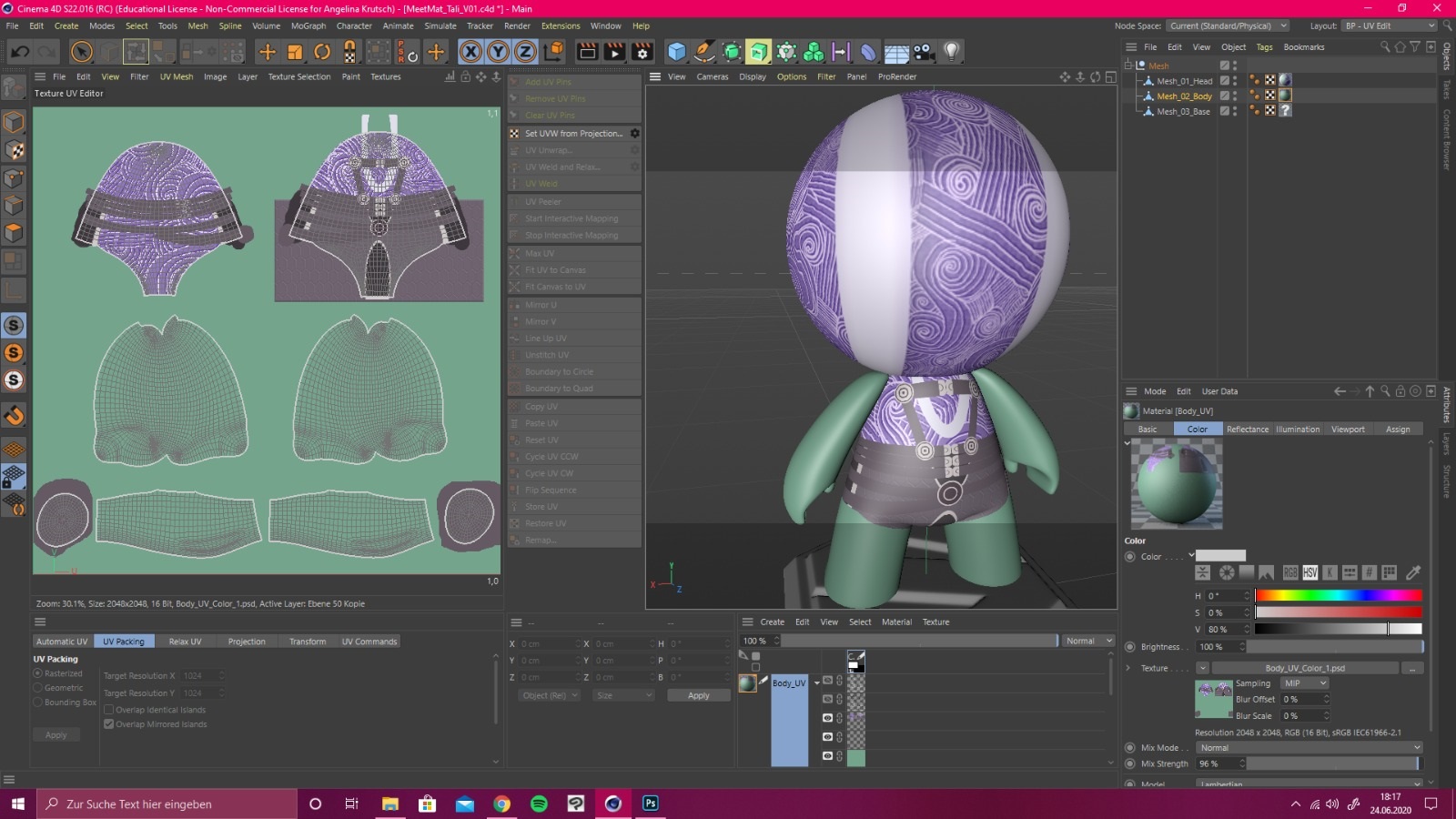 I unwrapped the Meetmat in Cinema and started to create the texture on the map I created. Meanwhile I had built two patterns for Tali. One to emulate her honeycomb-esque pattern and the other swirly one of her clothing. Of course we also had to think of the Bumb- and normal-masks as well. Yet because of all the tedious back and forth testing of the look on the meetmat I somehow corrupted the file with the map and meetmat, one day before it was due. So I had to cut the Meetmat open again, which wasn’t as tedious on this try as I already knew my pattern.
