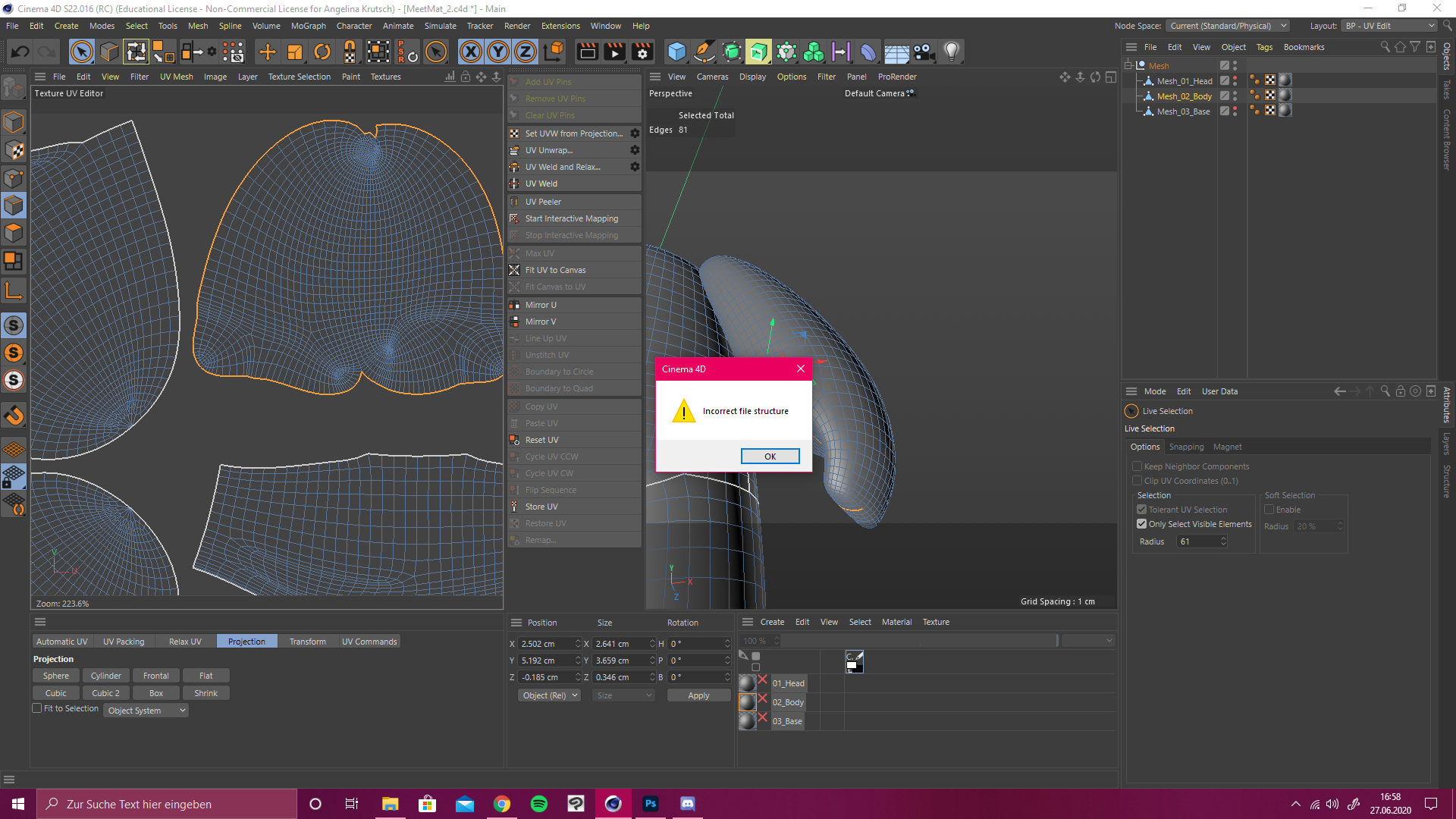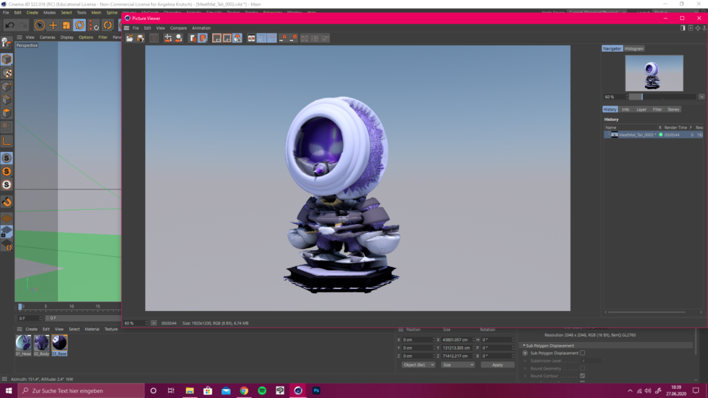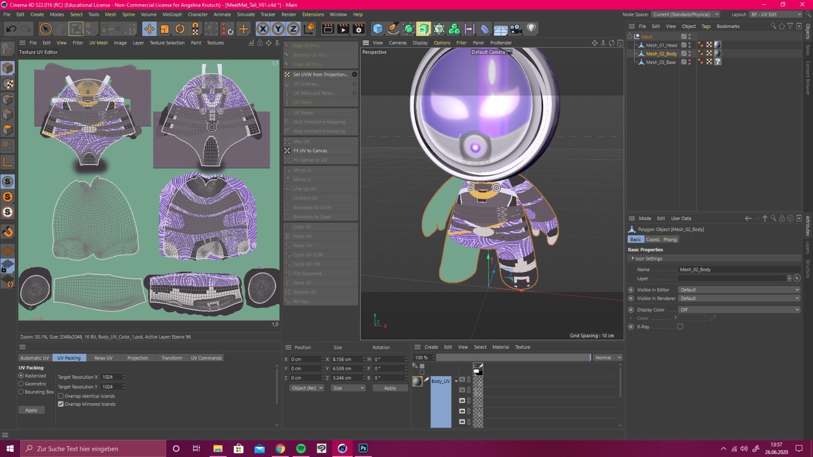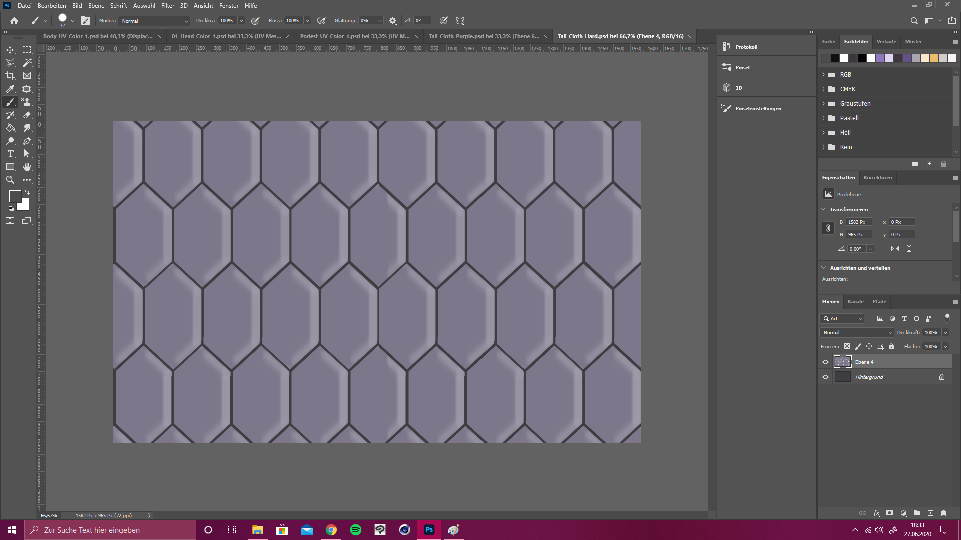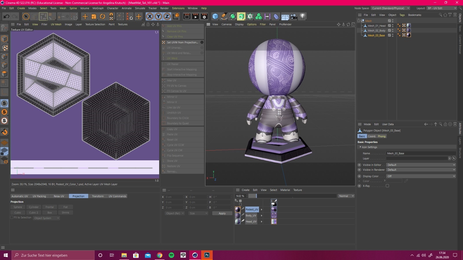 I unwrapped the Meetmat in Cinema and started to create the texture on the map I created. Meanwhile I had built two patterns for Tali. One to emulate her honeycomb-esque pattern and the other swirly one of her clothing. Of course we also had to think of the Bumb- and normal-masks as well. Yet because of all the tedious back and forth testing of the look on the meetmat I somehow corrupted the file with the map and meetmat, one day before it was due. So I had to cut the Meetmat open again, which wasn’t as tedious on this try as I already knew my pattern.